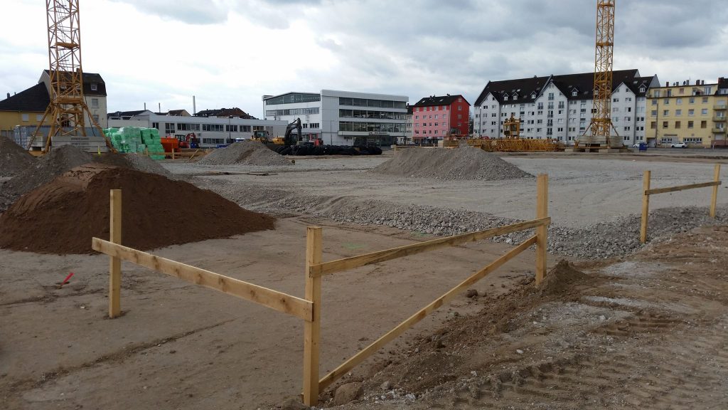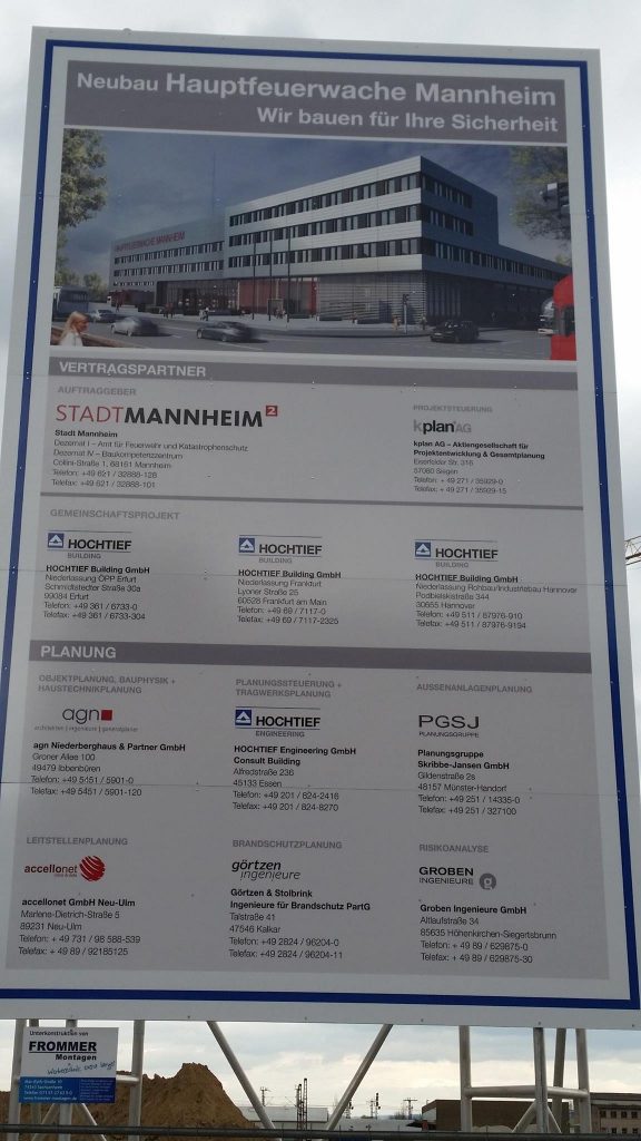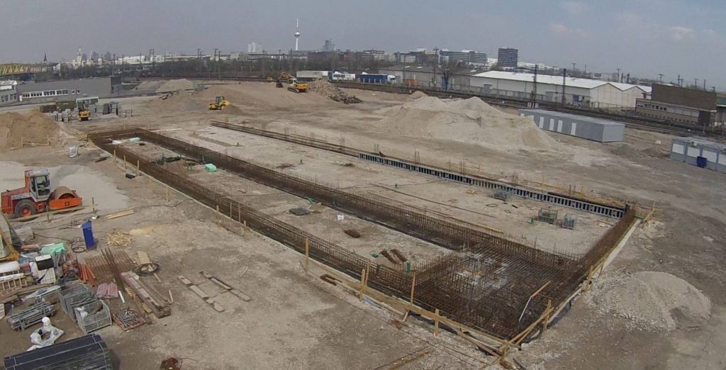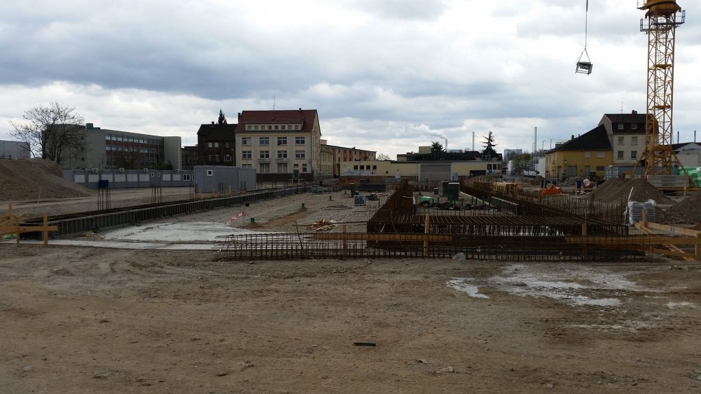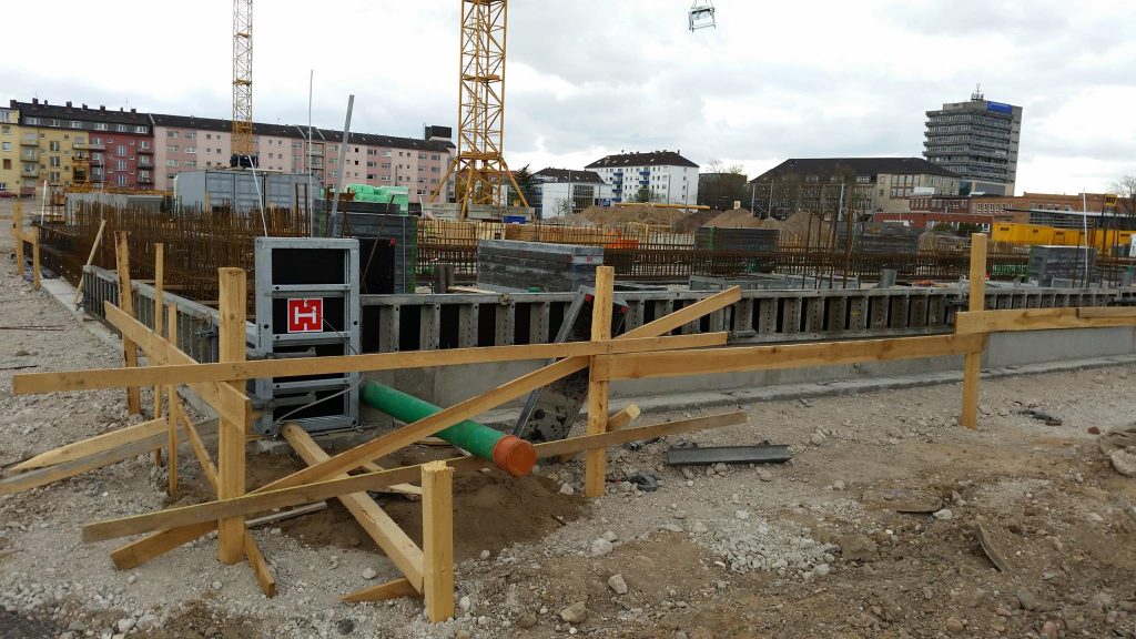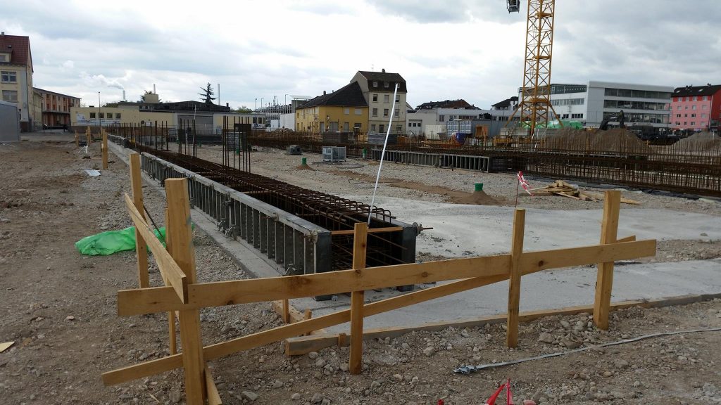 In den vergangenen zwei Wochen hat sich viel auf der Baustelle der neuen Hauptfeuerwache Mannheim getan. Nachdem in der Zwischenzeit die Baustelle final eingerichtet, ein zweiter Baukran gestellt wurde und Teile für einen dritten Kran bereit liegen, wurden ebenfalls erste sichtbare Baumaßnahmen eingeleitet. Die Bauarbeiten an den zwei Gleisüberquerungen sind im vollen Gange, auch der Gehweg in der Fabrikstationsstraße wird gesetzt. Neben dem nun offiziell gestellten Bauschild wird derzeit eine Sauberkeitsschicht auf dem Gelände eingebracht und die ersten Streifenfundamente und Sockel betoniert.