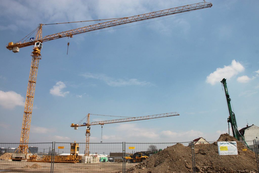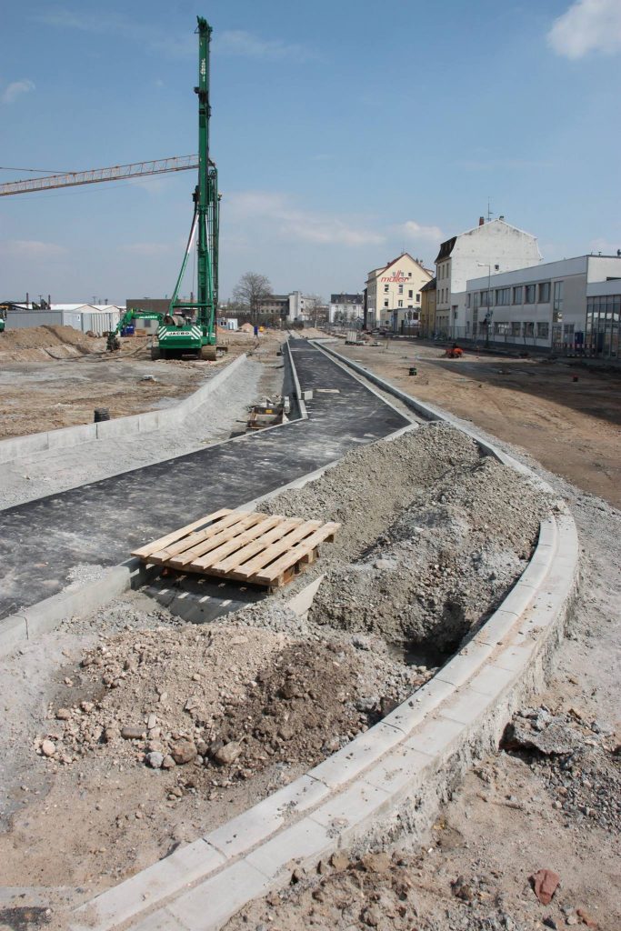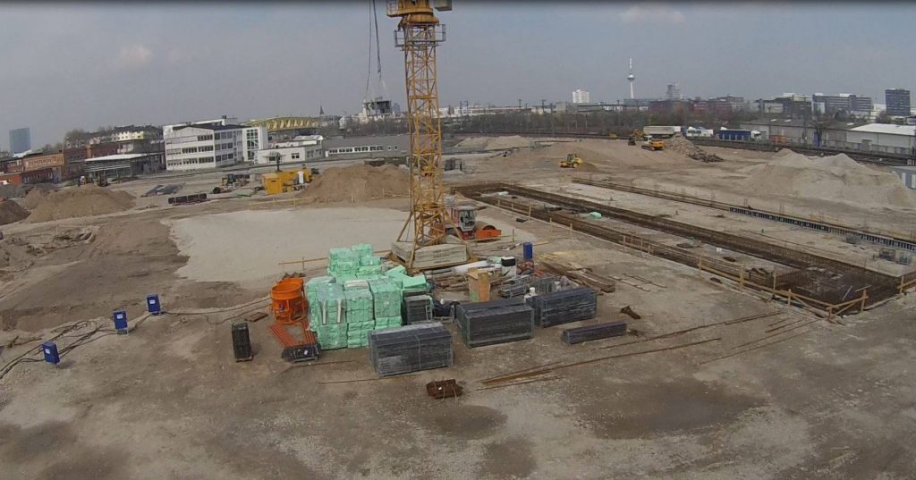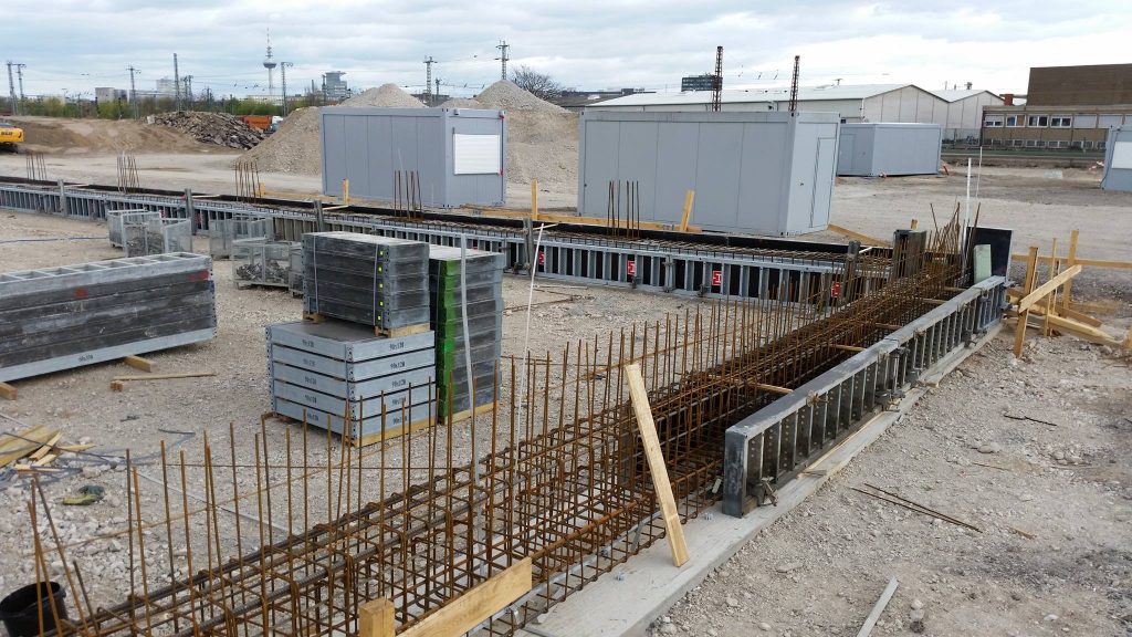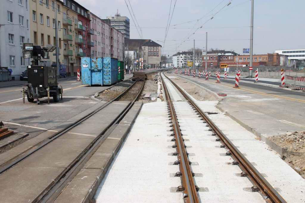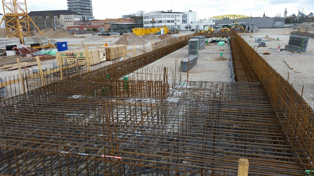 In den vergangenen zwei Wochen hat sich viel auf der Baustelle der neuen Hauptfeuerwache Mannheim getan. Nachdem in der Zwischenzeit die Baustelle final eingerichtet, ein zweiter Baukran gestellt wurde und Teile für einen dritten Kran bereit liegen, wurden ebenfalls erste sichtbare Baumaßnahmen eingeleitet. Die Bauarbeiten an den zwei Gleisüberquerungen sind im vollen Gange, auch der Gehweg in der Fabrikstationsstraße wird gesetzt. Neben dem nun offiziell gestellten Bauschild wird derzeit eine Sauberkeitsschicht auf dem Gelände eingebracht und die ersten Streifenfundamente und Sockel betoniert.