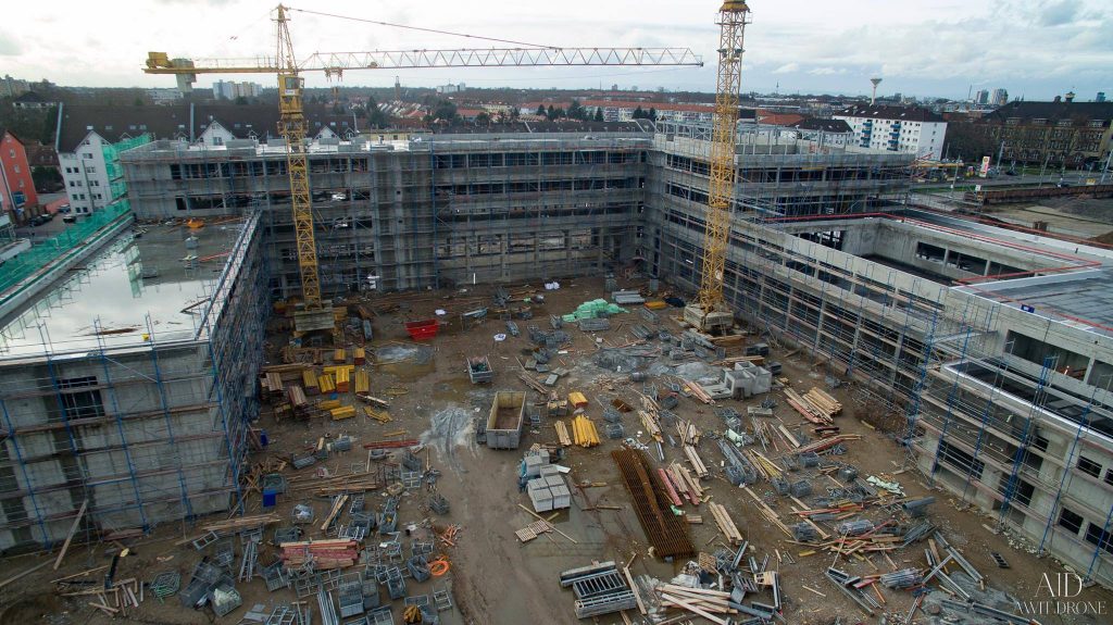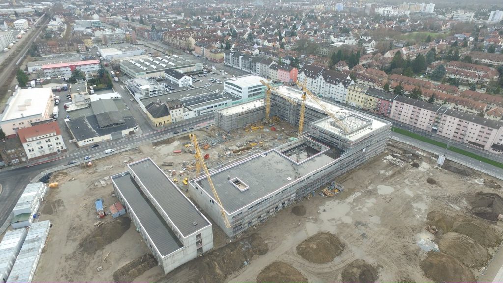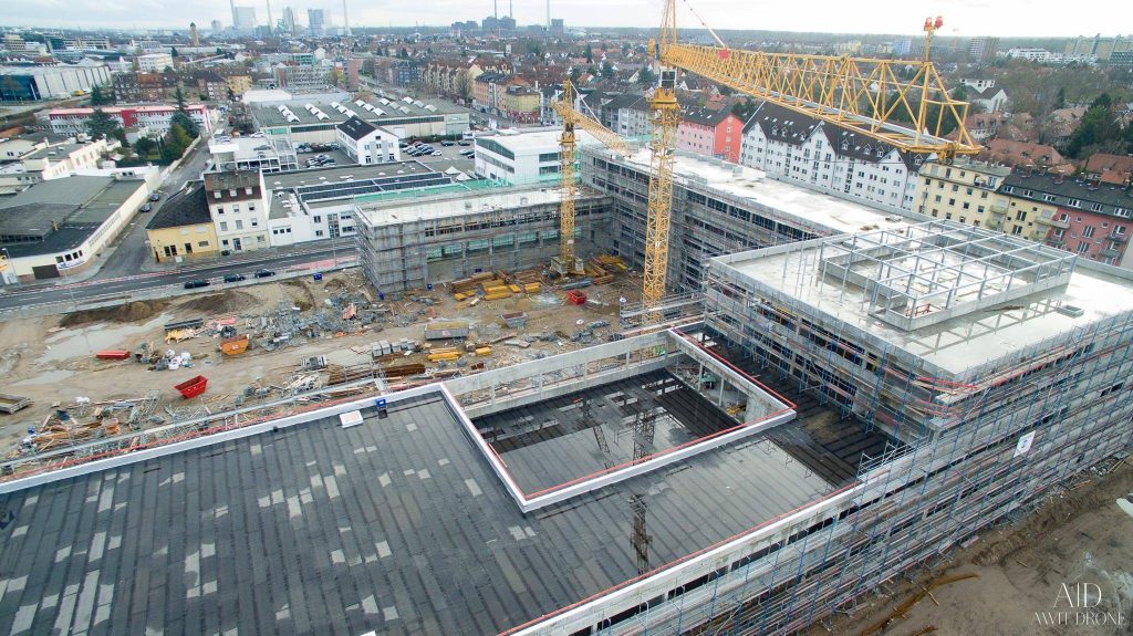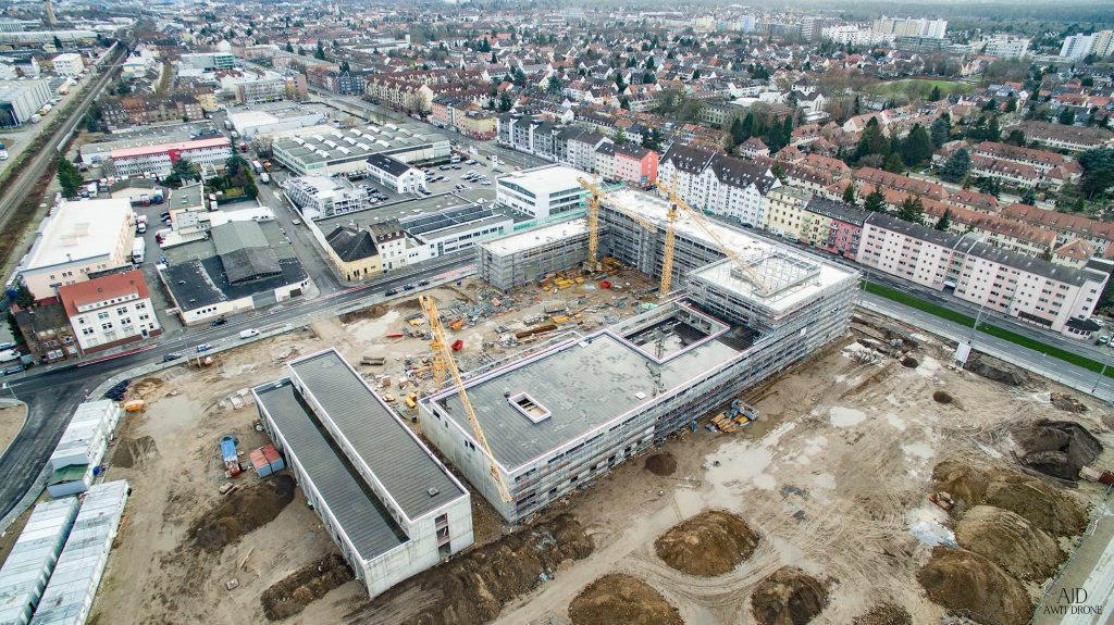 Feiertagsbilder von unserer Baustelle! Dank AWIT DRONE können wir euch den aktuellen Bauzustand an der Neckarauer Straße wieder aus verschiedensten Perspektiven aus der Luft zeigen. Der Rohbau ist fast fertig, in den kommenden Tagen werden zwei Kräne und das „Containerdorf“ abgebaut und das „Innenausbau-Jahr“ 2016 kann beginnen.
